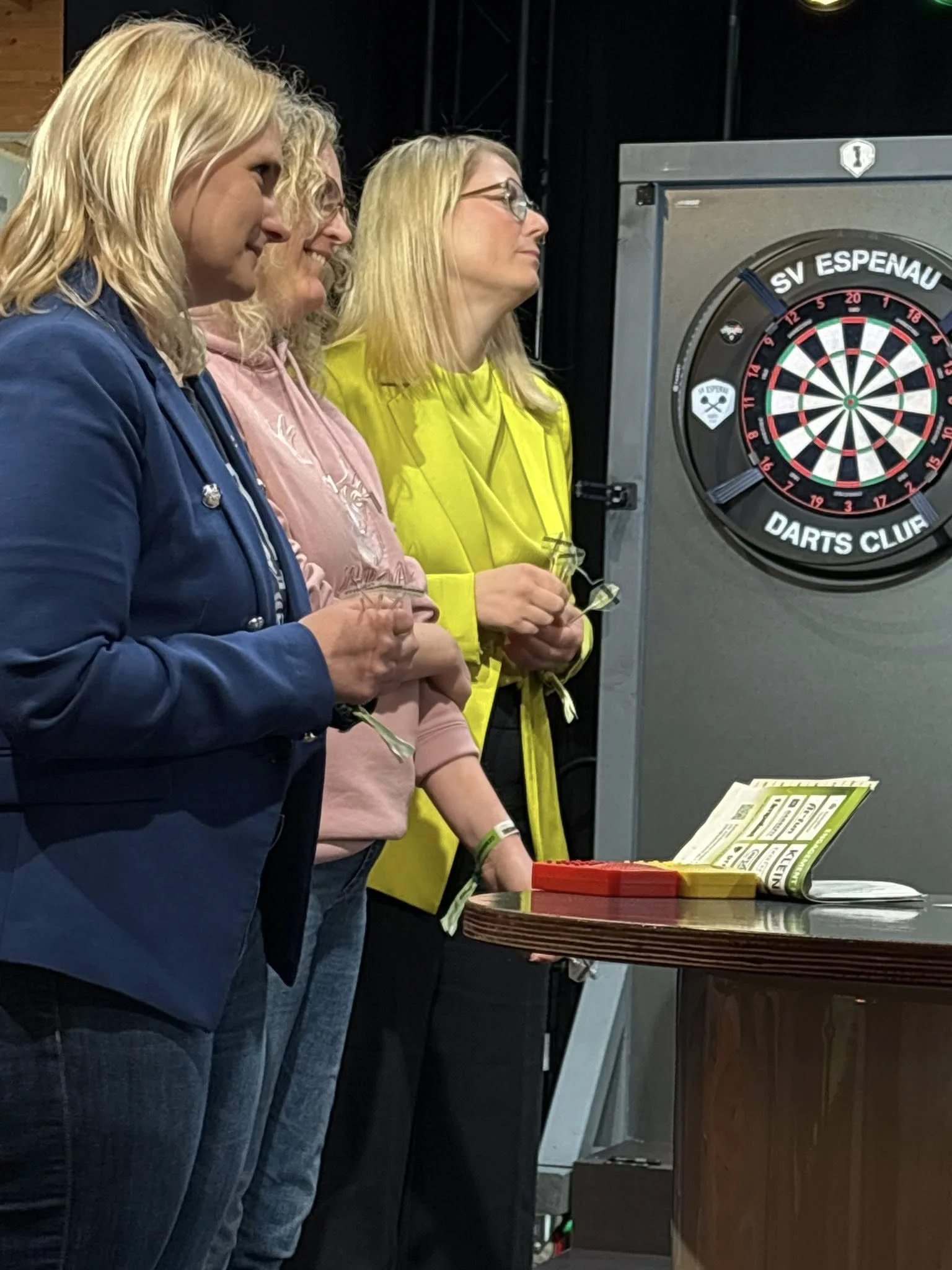 Das Promi Dartturnier begann bereits am Morgen mit einer Überraschung im Halbfinale, als die sehr stark aufspielende Zisselpräsidentin Christina Hackenberg den Mitfavoriten Boris Mijatovic aus dem Turnier warf.