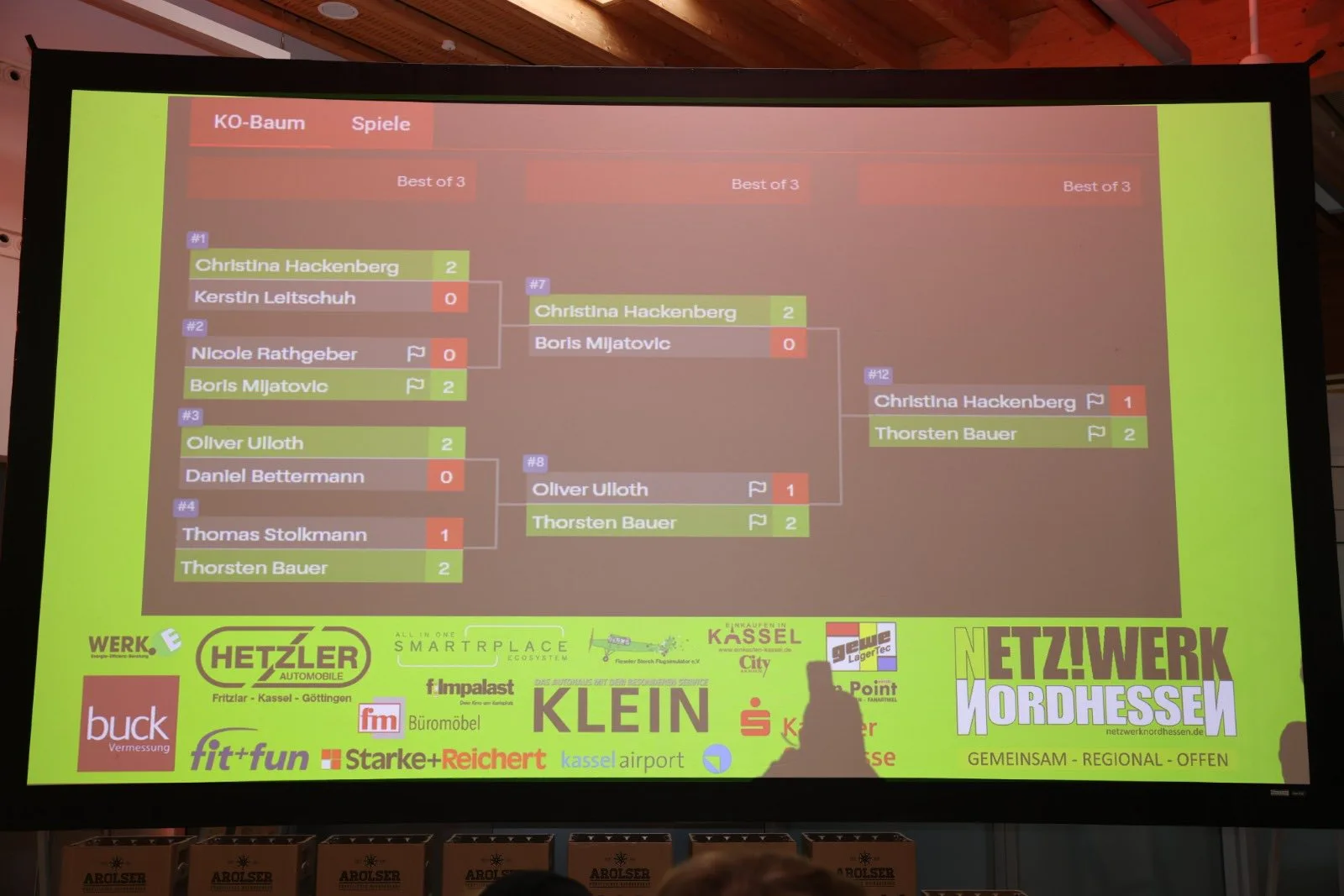 Im anderen Halbfinale setzte sich Fußballgott Thorsten Bauer gegen den ebenfalls stark spielenden Landtagsabgeordneten Oliver Ulloth durch, so dass es zum Finale Christina gegen Thorsten kam, welches der ehemalige Löwen Goalgetter für sich entscheiden konnte.